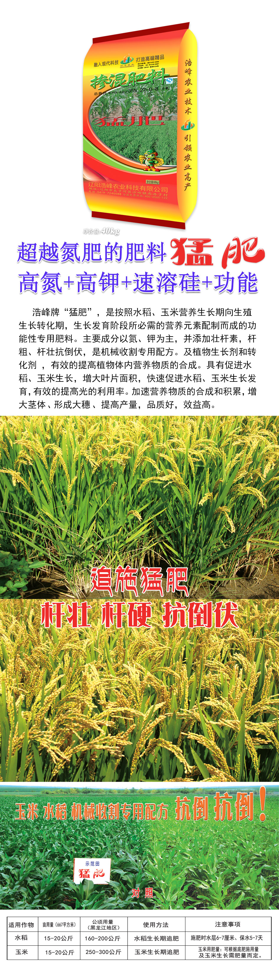 浩峰牌“猛肥”,是按照水稻、玉米營養(yǎng)生長期向生殖生長轉(zhuǎn)化期,生長發(fā)育階段所必需的營養(yǎng)元素配制而成的功能性專用肥料。主要成分以氮、鉀為主,并添加壯桿素,桿粗、桿壯抗倒伏,是機械收割專用配方。及植物生長劑和轉(zhuǎn)化劑 ,有效的提高植物體內(nèi)營養(yǎng)物質(zhì)的合成。具有促進水稻、玉米生長,增大葉片面積,快速促進水稻、玉米生長發(fā)育,有效的提高光的利用率。加速營養(yǎng)物質(zhì)的合成和積累,增大莖體、形成大穗、提高產(chǎn)量,品質(zhì)好,效益高。