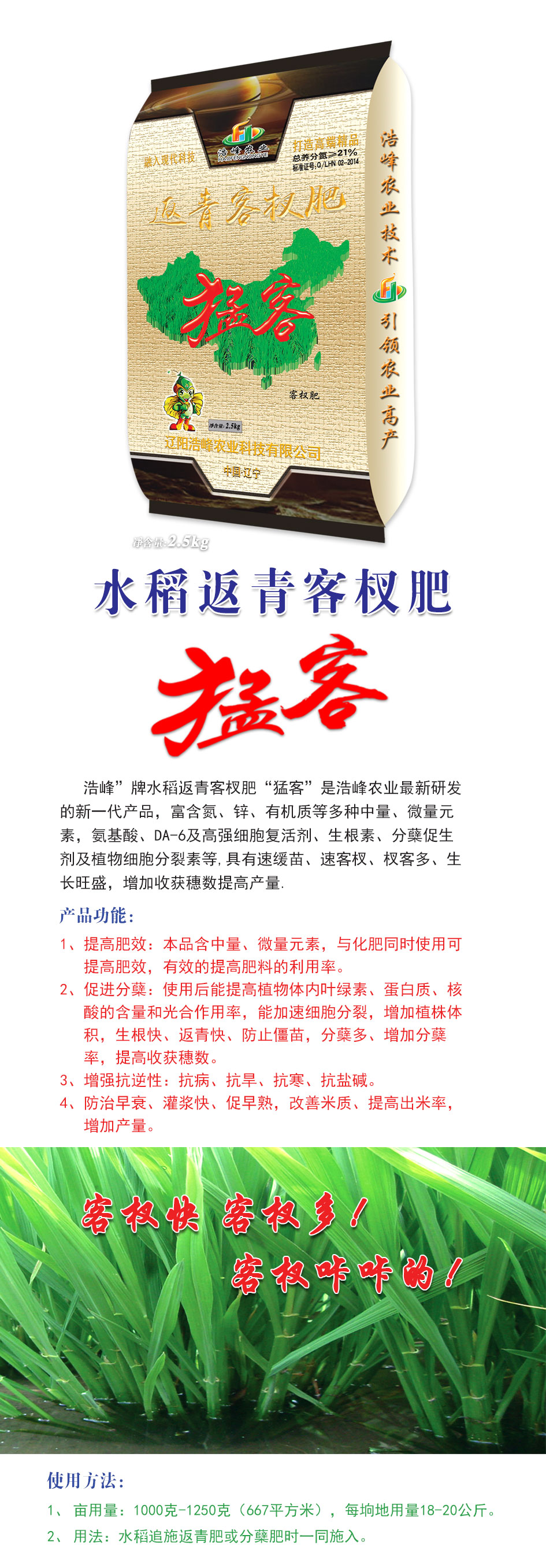 浩峰”牌水稻返青客杈肥“猛客”是浩峰農(nóng)業(yè)最新研發(fā)的新一代產(chǎn)品,富含氮、鋅、有機(jī)質(zhì)等多種中量、微量元素,氨基酸、DA-6及高強(qiáng)細(xì)胞復(fù)活劑、生根素、分蘗促生劑及植物細(xì)胞分裂素等,具有速緩苗、速客杈、杈客多、生長旺盛,增加收獲穗數(shù)提高產(chǎn)量。