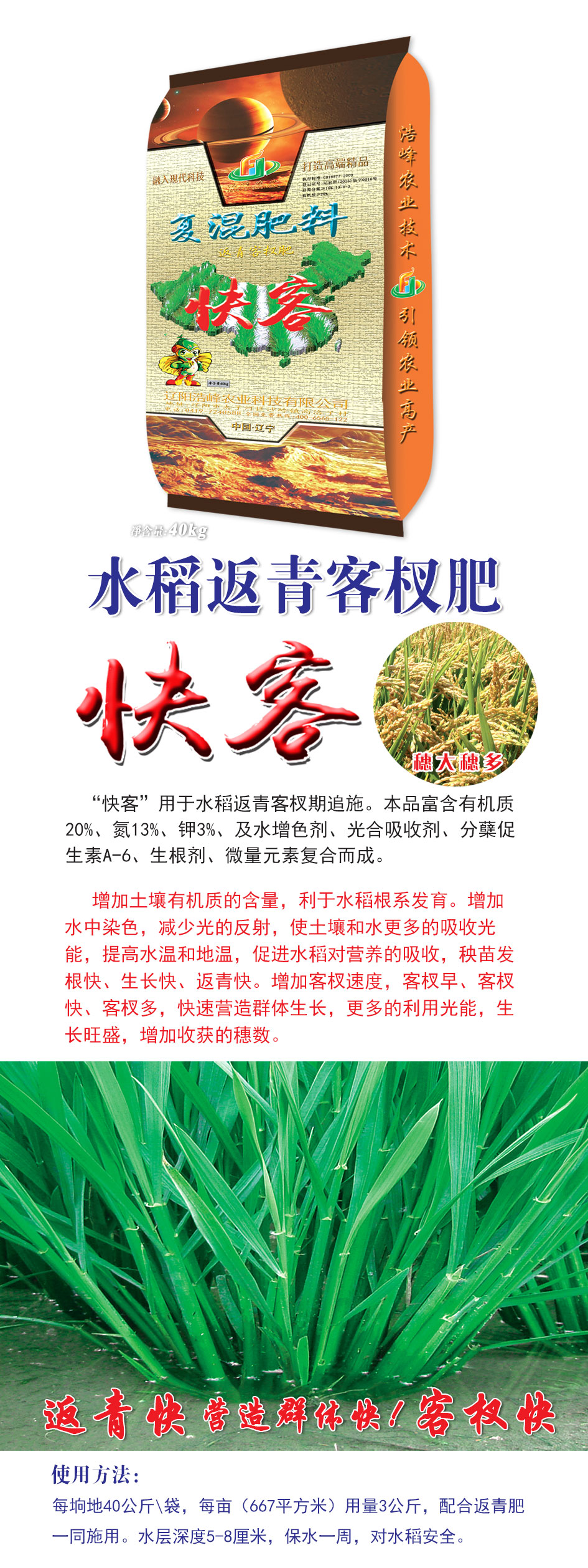 “快客”用于水稻返青客杈期追施。本品富含有機(jī)質(zhì)20%、氮13%、鉀3%、及水增色劑、光合吸收劑、分蘗促生素A-6、生根劑、微量元素復(fù)合而成。