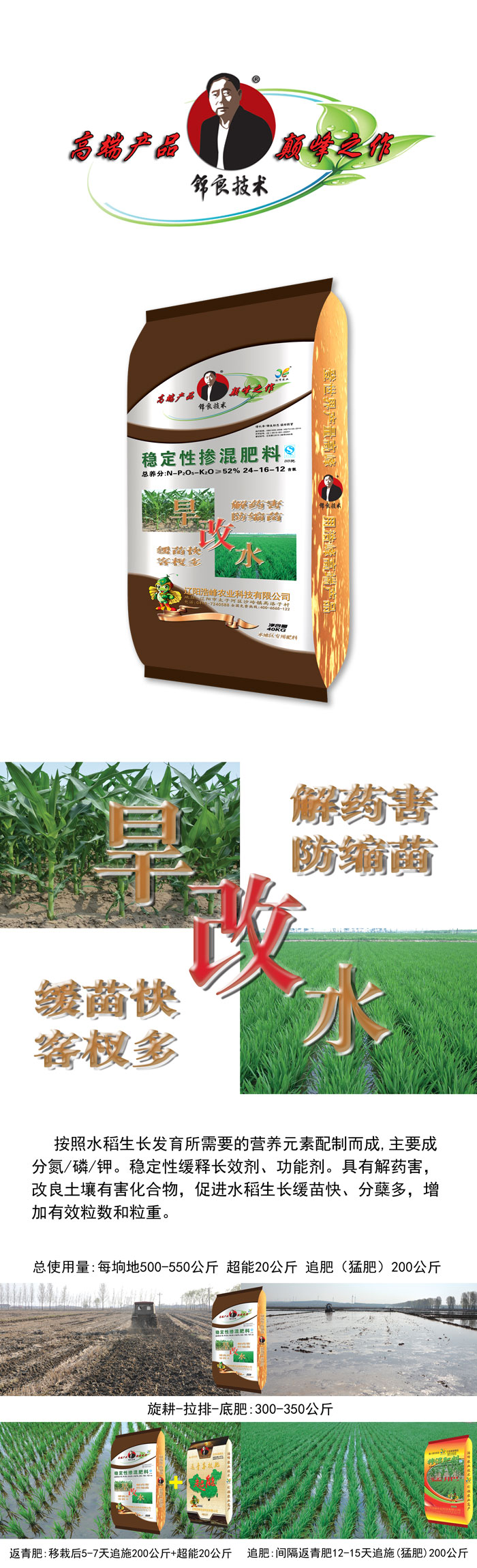 按照水稻生長發(fā)育所需要的營養(yǎng)元素配制而成,主要成分氮/磷/鉀。穩(wěn)定性緩釋長效劑、功能劑。具有解藥害,改良土壤有害化合物,促進水稻生長緩苗快、分蘗多,增加有效粒數(shù)和粒重。