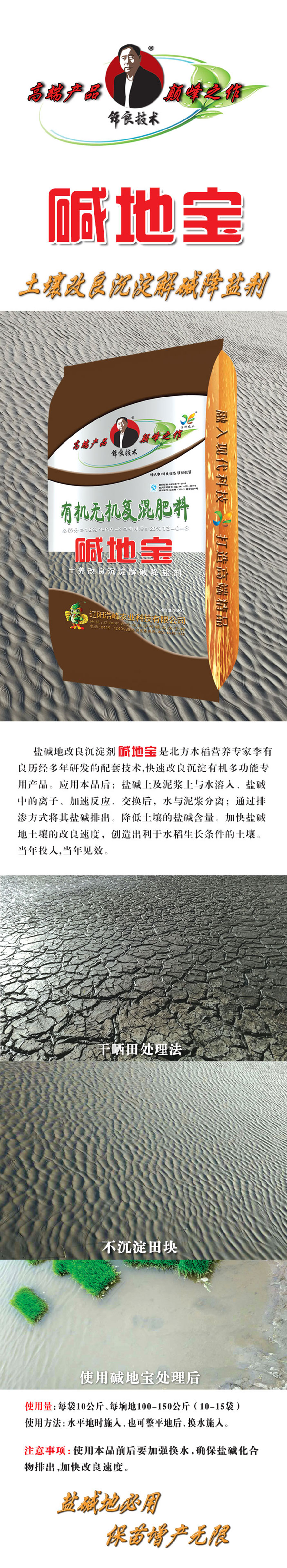 鹽堿地改良沉淀劑是北方水稻營養(yǎng)專家李有良歷經多年研發(fā)的配套技術,快速改良沉淀有機多功能專用產品。應用本品后;鹽堿土及泥漿土與水溶入、鹽堿中的離子、加速反應、交換后,水與泥漿分離;通過排滲方式將其鹽堿排出。降低土壤的鹽堿含量。加快鹽堿地土壤的改良速度,創(chuàng)造出利于水稻生長條件的土壤。當年投入,當年見效。